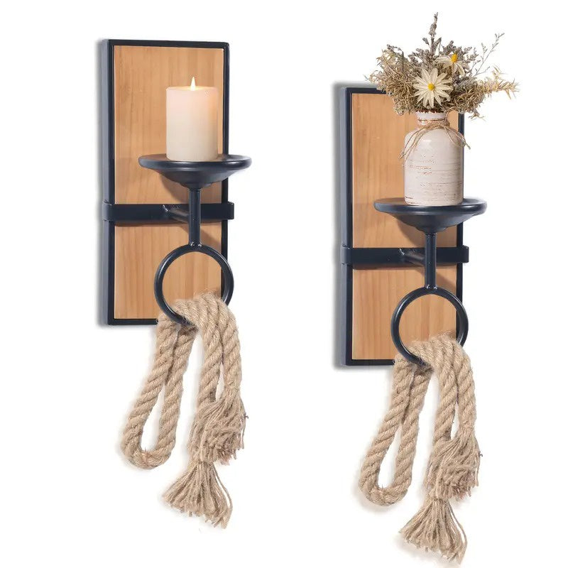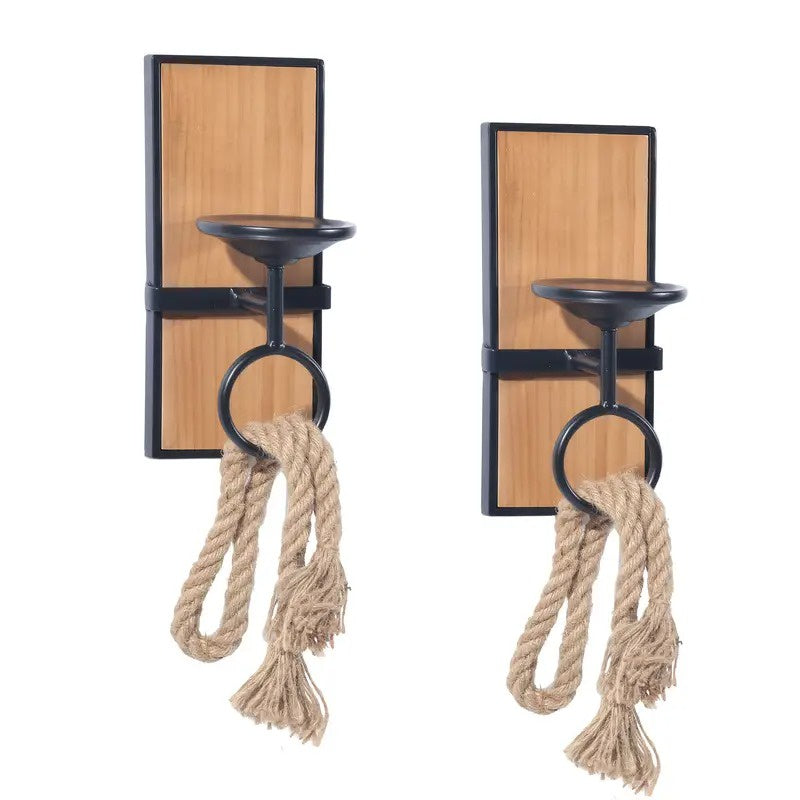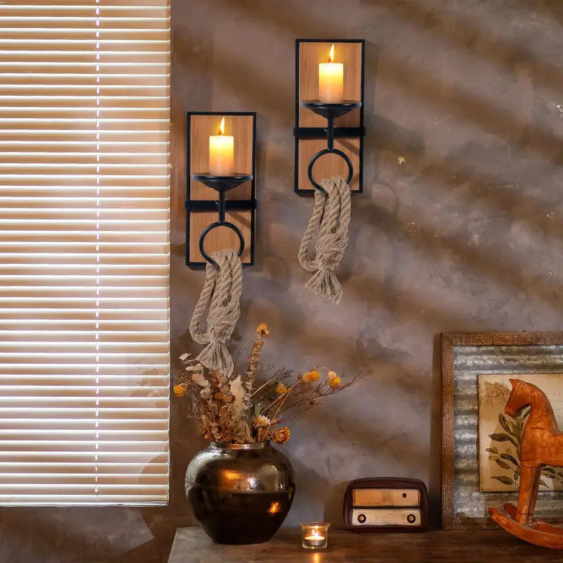 • Estilo: Portavelas de pared con base rectangular y cuerda colgante.
