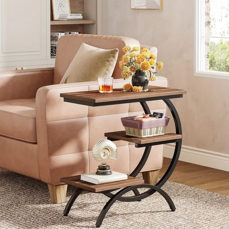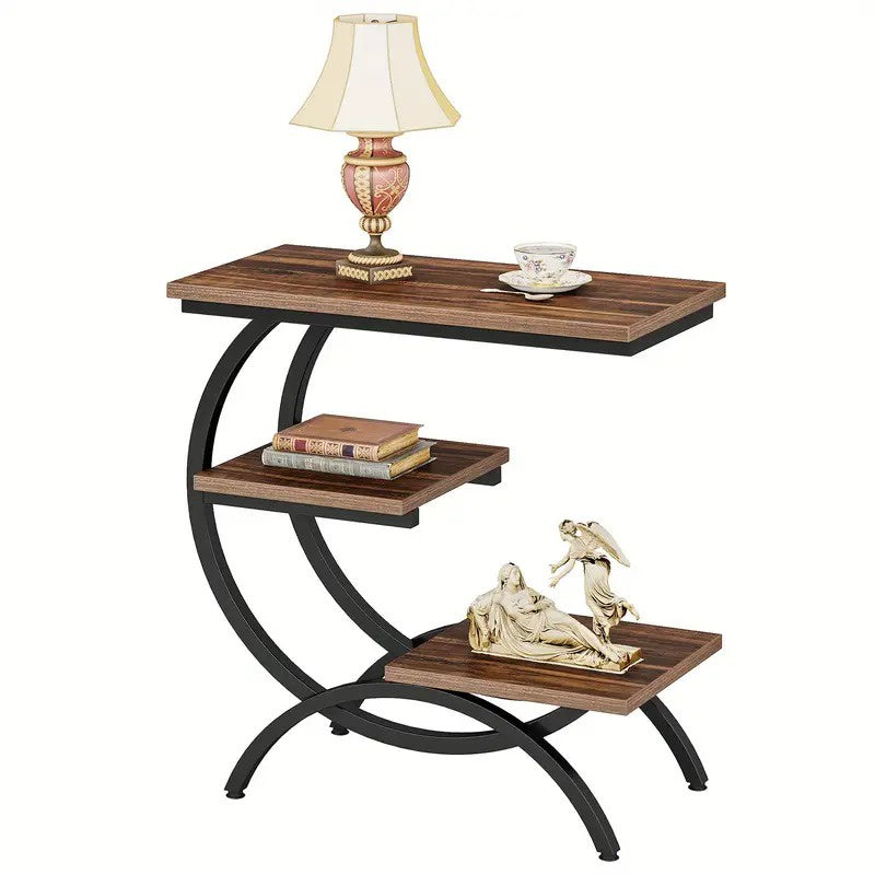 Esta mesa auxiliar tiene tres niveles. La superficie principal es rectangular. Debajo de la superficie principal, hay dos estantes cuadrados más pequeños que están desplazados respecto al centro. Los estantes están sostenidos por un marco curvo que forma una C, conectando todos los niveles.